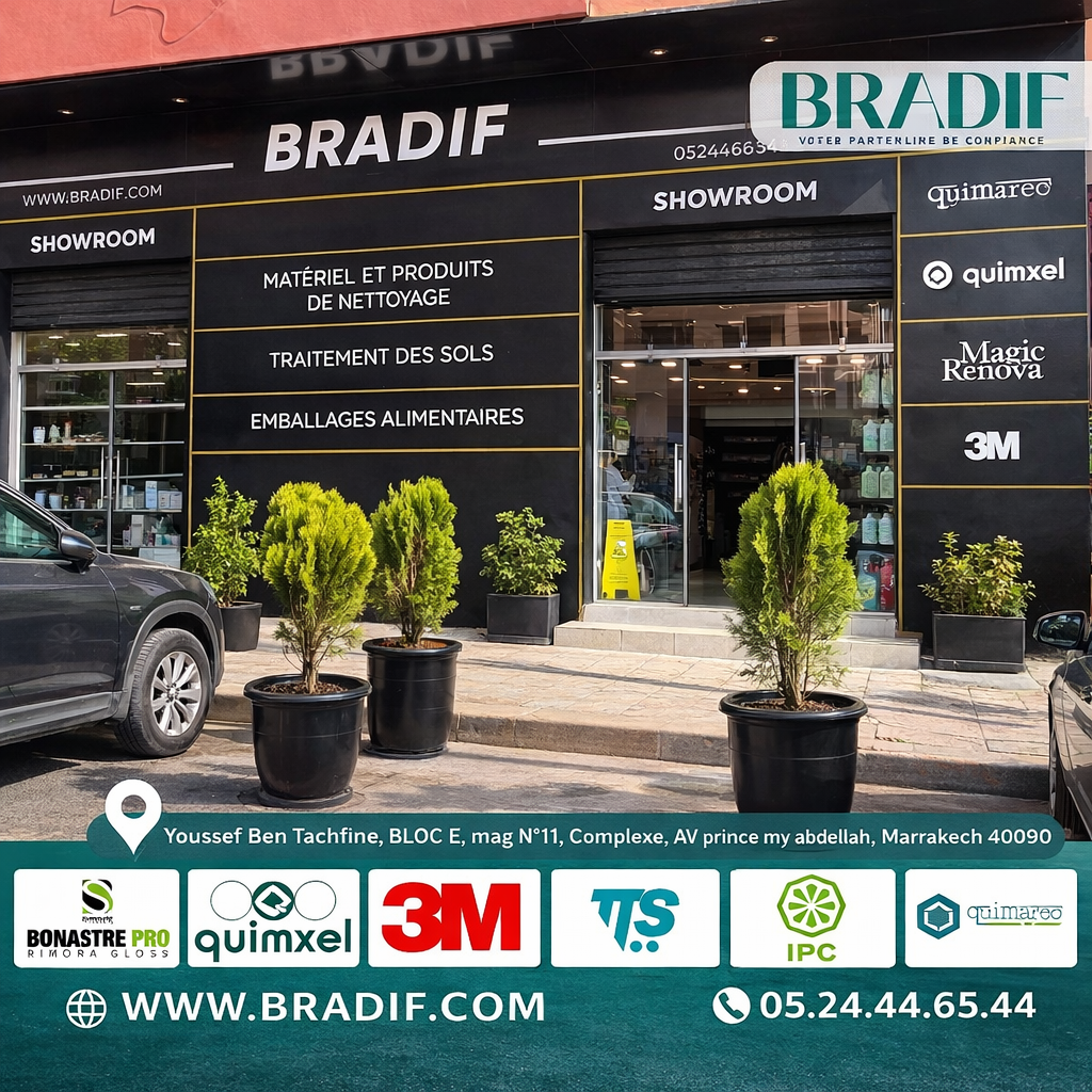 Bradif est le distributeur exclusif de la gamme Quimxel, une référence reconnue dans le domaine des solutions professionnelles de nettoyage et de traitement des surfaces. Grâce à ce partenariat, nous mettons à la disposition de nos clients des produits innovants, performants et conformes aux normes de qualité les plus exigeantes.